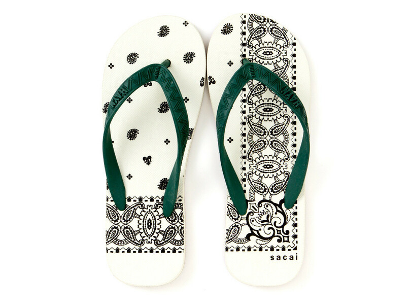 本コラボレーションでは、「サカイ」2016年初夏コレクションのアイコンであるバンダナ柄を左右で柄が続くようにデザインし、底面には反転した「サカイ」のロゴを型押しすることで、砂浜を歩いた時に足跡で「サカイ」のロゴが刻まれる、粋なディティールを施した。