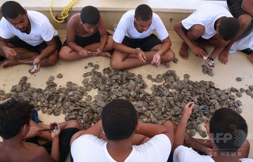 【8月3日 AFP】クウェートの首都クウェート市(Kuwait City)から約100キロメートル南に位置する港町カイラン(Khairan)では真珠採りのシーズンを迎え、ダイバーたちが昔ながらのダウ船を使って真珠貝を採取する姿が見られた。(c)AFP