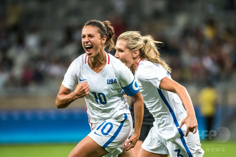 一方、女子W杯カナダ大会(FIFA Women's World Cup 2015)を制した米国は、2-0でニュージーランドに勝利した。競技採用から6大会目で5度目の金メダルを目指す米国は、カーリー・ロイド(Carli Lloyd)が先制点を決めると、アレックス・モーガン(Alex Morgan)が追加点を挙げた。(c)AFP/Kieran CANNING