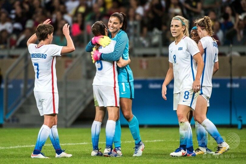一方、女子W杯カナダ大会(FIFA Women's World Cup 2015)を制した米国は、2-0でニュージーランドに勝利した。競技採用から6大会目で5度目の金メダルを目指す米国は、カーリー・ロイド(Carli Lloyd)が先制点を決めると、アレックス・モーガン(Alex Morgan)が追加点を挙げた。(c)AFP/Kieran CANNING