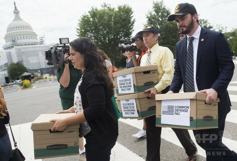 【8月5日 AFP】米首都ワシントン(Washington D.C.)の連邦議会議事堂で4日、退役軍人らが、大統領選の共和党候補ドナルド・トランプ(Donald Trump)氏への支持撤回をジョン・マケイン(John McCain)上院議員ら党幹部に求める嘆願書を提出した。
