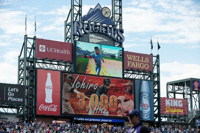 ロッキーズ2番手のクリス・ルーシン(Chris Rusin)の時速86マイル(約138キロ)の投球をイチローが打ち返すと、高く上がった打球は右翼フェンスの得点板を直撃する三塁打となった。