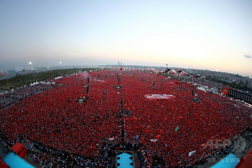 【8月8日 AFP】トルコの最大都市イスタンブール(Istanbul)で7日、先月のクーデター未遂に抗議する大規模集会がレジェプ・タイップ・エルドアン (Recep Tayyip Erdogan)大統領の呼び掛けで開かれた。野党の党首らも参加して事件の首謀者らに対して団結を示した形で、政権寄りのメディアや当局者は数百万人が集まったとしている。