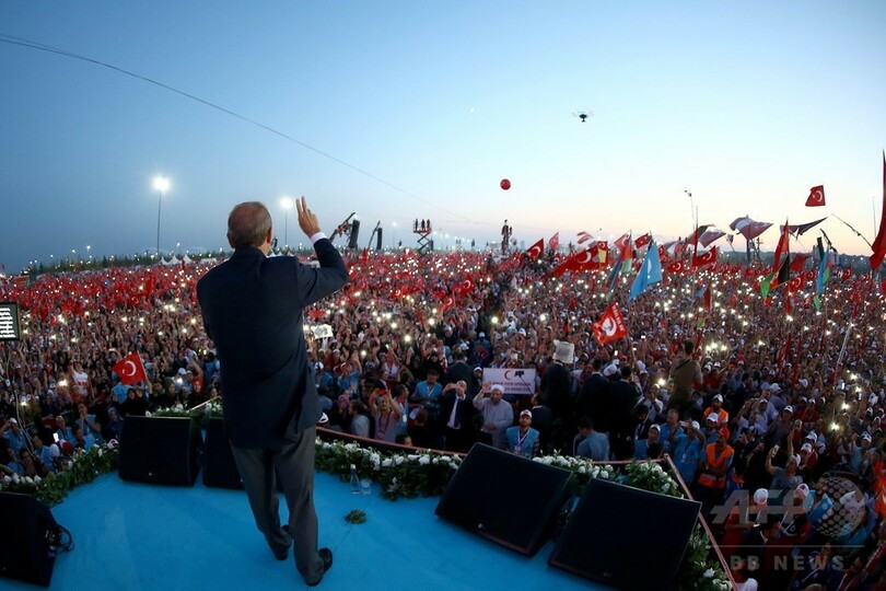 演説を行ったエルドアン大統領は死刑制度の復活についても言及し、国民が死刑復活を求めれば各政党は国民の意思を尊重するはずだと強調。「主権が国民にある以上、死刑制度について決めるのは議会だ。議会が決定すれば承認する」と踏み込んだ。(c)AFP/Fulya Ozerkan with Raziye Akkoc in Ankara