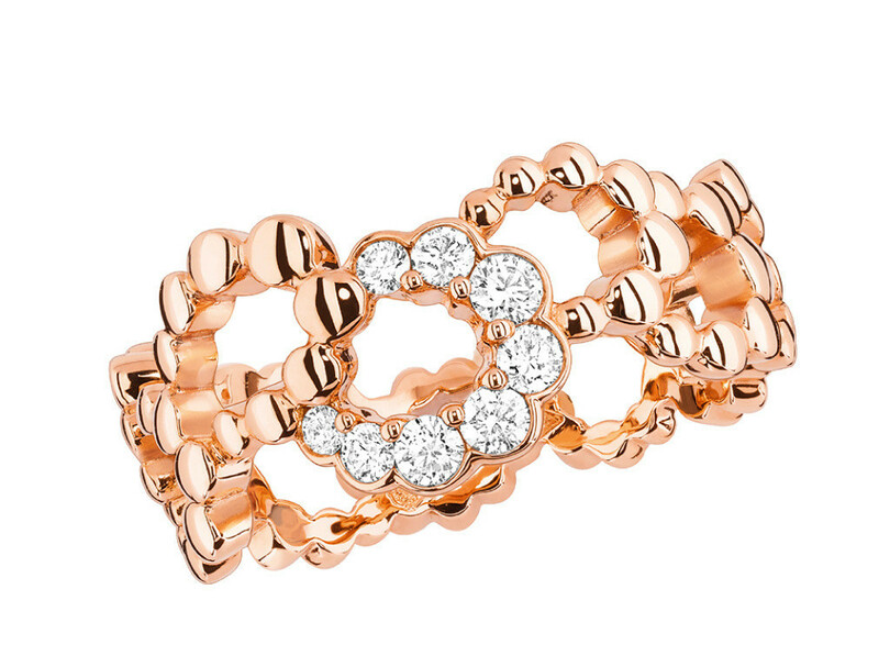 新作は、1948年に誕生したバックにボリュームを持たせた千鳥格子の「ココット」ドレスをインスピレーションに、ホワイトゴールドとダイヤモンドのアシンメトリーなリングとネックレスが登場。また、「ミリュ ドゥ シェクル」ラインの、布地に宿る幾何学を基にしたデザインに着想を得て、ホワイトゴールドとダイヤモンドのネックレスやピアス2種、ホワイトゴールドにダイヤモンドおよびピンクゴールドにダイヤモンド(またはダイヤモンドなし)のリング3種を新たに加えた。