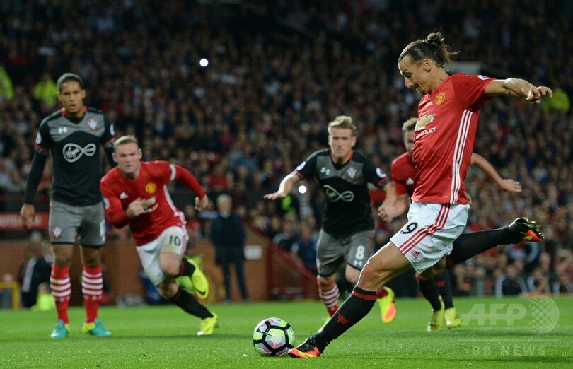 ユナイテッドは前半36分にズラタン・イブラヒモビッチ(Zlatan Ibrahimovic)が先制点を決めると、後半7分にPKから再びイブラヒモビッチが得点した。(c)AFP