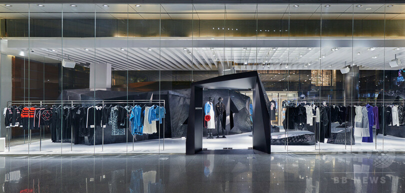 先日オープンした青山店とはまた違ったコンセプトで作り上げられた同店。建築家の高濱史子(Fumiko Takahama)が、日本の伝統的な「枯山水」をモダンな様式で表現した。1700スクエアフィートにも及ぶこの広大な空間はパンチングメタルのシートによりデコレーションされ、岩々のようなオブジェはディスプレイのほかに椅子としても機能する。さらにフューチャリスティックな試着室もこのショップの魅力的な特徴だ。