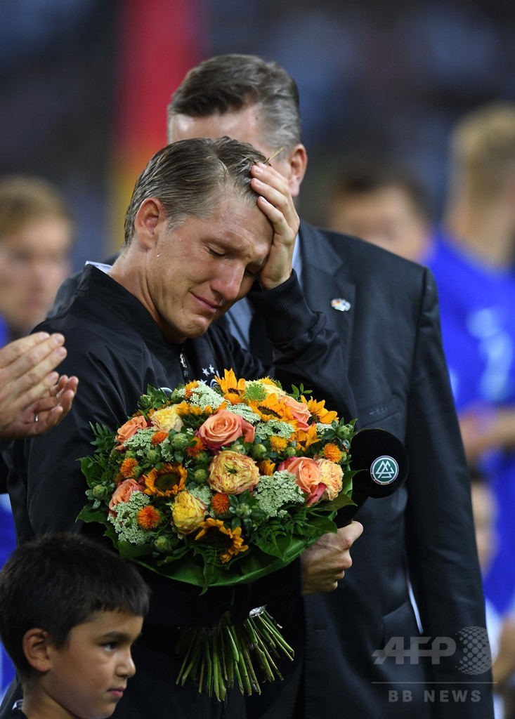 試合前のセレモニーでドイツサッカー連盟(DFB)のラインハルト・グリンデル(Reinhard Grindel)会長にたたえられ、すでに涙をこらえるので精いっぱいだったシュバインシュタイガーは、ボルシア・パルク(Borussia Park)のファンにスタンディングオベーションで迎えられると、涙を流さずにはいられなかった。