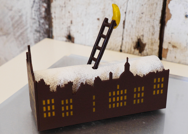 静かな夜、しんしんと降りそそぐ粉雪が街中を白く染めてゆく。屋上のはしごを上ると、そこにはお月さまが・・・子どもの頃に観た物語のワンシーンを思い出させるような「ビュッシュ レーヴ」は創造性をテーマにした作品。ショコラにマッチするオレンジがアクセントに。