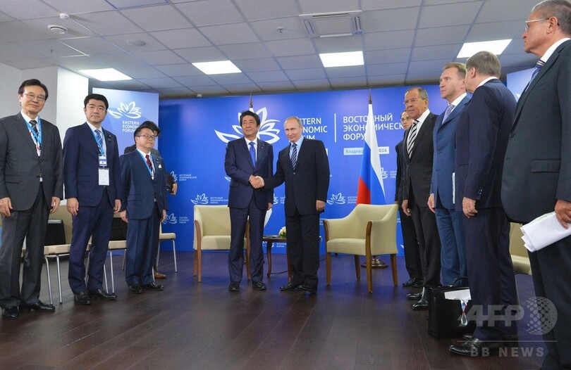 【9月3日 AFP】安倍晋三(Shinzo Abe)首相とロシアのウラジーミル・プーチン(Vladimir Putin)大統領は2日、ロシア極東のウラジオストク(Vladivostok)で開催された「東方経済フォーラム」出席に合わせて会談し、両国間の貿易促進と長引く北方領土問題の前進を図って意見を交わした。しかし、領土問題で大きな進展には至らなかった。