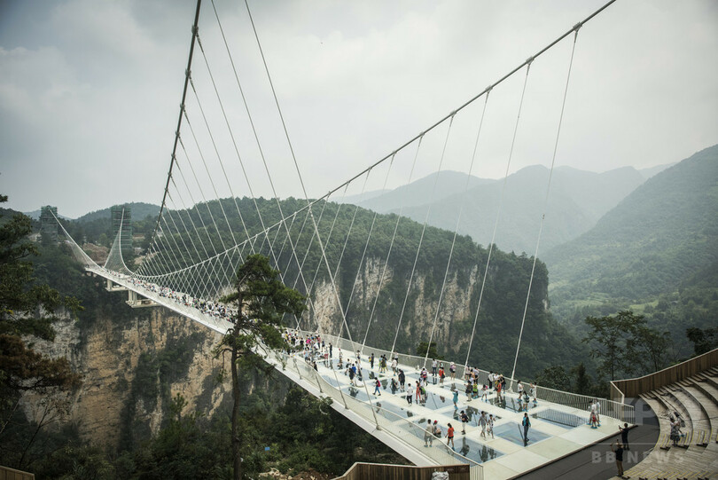 【9月3日 AFP】(写真追加)中国・湖南(Hunan)省の景勝地、張家界(Zhangjiajie)に架かる世界で最も長いガラスの橋が、開通からわずか2週間もたたずに、観光客らが殺到したことを受けて閉鎖された。