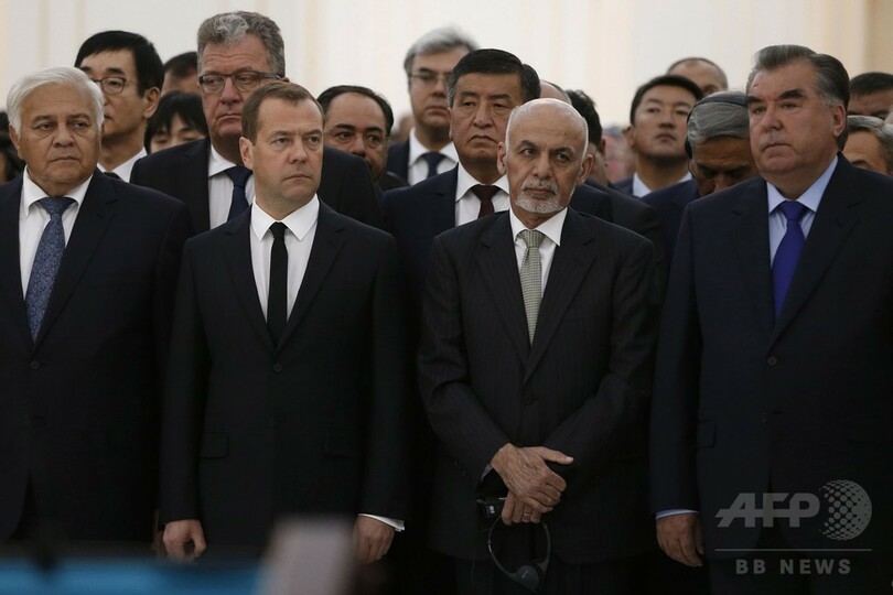国営テレビの映像には、そびえ立つ神学校に囲まれた広場で、白いシャツを着た男性たちに運ばれるカリモフ氏のひつぎを見守る隣国アフガニスタンのアシュラフ・ガニ(Ashraf Ghani)大統領ら大勢の参列者が映っていた。