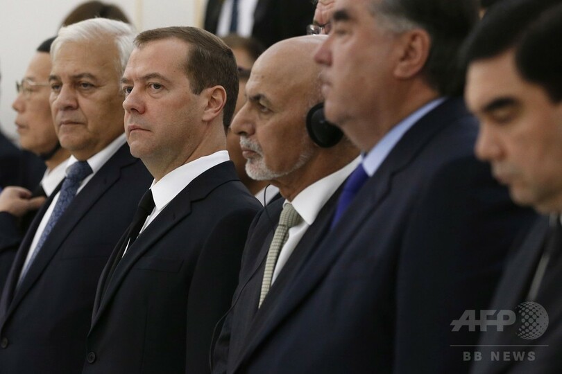 国営テレビの映像には、そびえ立つ神学校に囲まれた広場で、白いシャツを着た男性たちに運ばれるカリモフ氏のひつぎを見守る隣国アフガニスタンのアシュラフ・ガニ(Ashraf Ghani)大統領ら大勢の参列者が映っていた。