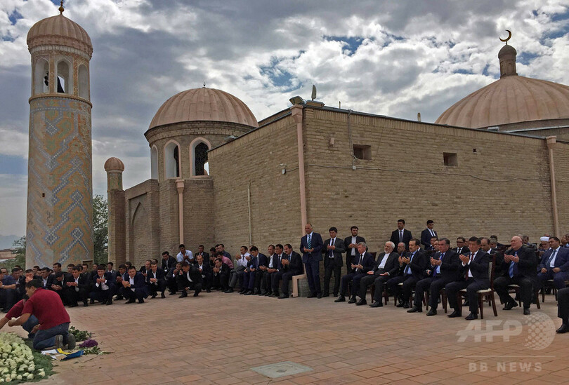 国営テレビの映像には、そびえ立つ神学校に囲まれた広場で、白いシャツを着た男性たちに運ばれるカリモフ氏のひつぎを見守る隣国アフガニスタンのアシュラフ・ガニ(Ashraf Ghani)大統領ら大勢の参列者が映っていた。