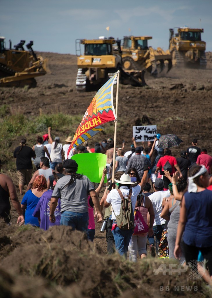【9月5日 AFP】(写真追加)米中西部最北のノースダコタ(North Dakota)州にある先住民スタンディングロック・スー族(Standing Rock Sioux Tribe)の居留地近くで3日午後、石油パイプライン建設に反対する先住民ら数百人と建設会社の作業員や警備員が衝突した。先住民たちは、先祖ゆかりの聖地を建設作業員らが破壊していると非難している。