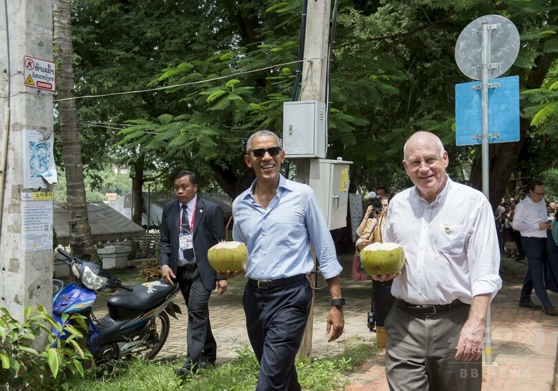 【9月7日 AFP】ラオスの古都ルアンプラバン(Luang Prabang)で7日、東南アジア諸国連合(ASEAN)首脳会議に出席するため同国を訪れていたバラク・オバマ(Barack Obama)米大統領が、同市を流れるメコン川(Mekong River)のほとりに飲み物を求めて立ち寄り、ココナツジュースを飲む姿が見られた。
