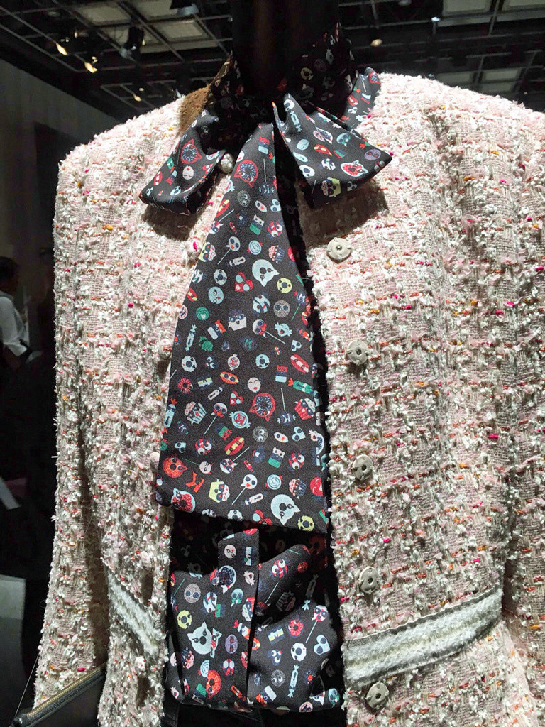 ツイードワンピやノーカラージャケット、またラガーフェルド自身のシグネチャーでもあるフィンガーレスグローブなどはファンなら垂涎もののアイテム。またラガーフェルドの愛猫シュペット(Choupette)も、かわいらしいイラストとなってコレクションに華を添えている。