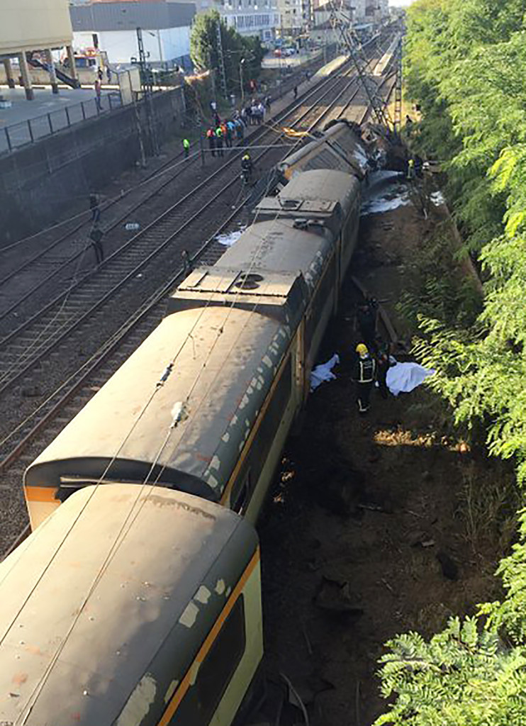 スペインでは2013年、ガリシア自治州のサンティアゴ・デ・コンポステーラ(Santiago de Compostela)郊外で旅客列車が脱線してコンクリートの壁に衝突し、約80人が死亡、144人が負傷する史上最悪規模の事故が起きた。(c)AFP