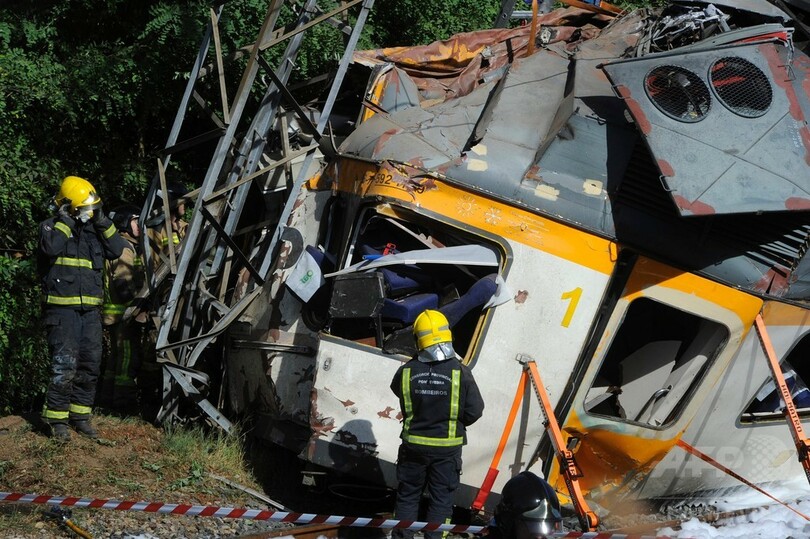 スペインでは2013年、ガリシア自治州のサンティアゴ・デ・コンポステーラ(Santiago de Compostela)郊外で旅客列車が脱線してコンクリートの壁に衝突し、約80人が死亡、144人が負傷する史上最悪規模の事故が起きた。(c)AFP