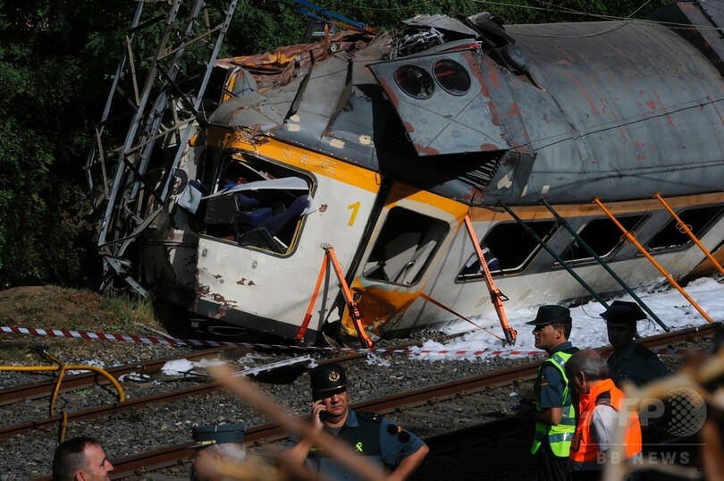 スペインでは2013年、ガリシア自治州のサンティアゴ・デ・コンポステーラ(Santiago de Compostela)郊外で旅客列車が脱線してコンクリートの壁に衝突し、約80人が死亡、144人が負傷する史上最悪規模の事故が起きた。(c)AFP