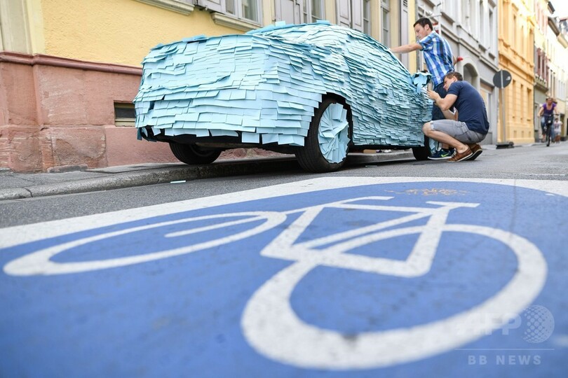 【9月10日 AFP】ドイツ西部ハイデルベルク(Heidelberg)市で9日、駐車禁止区域に止められた車に人々が付箋を貼り付ける姿が見られた。