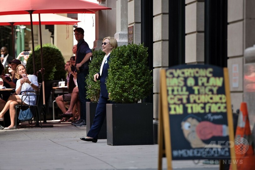 動画には、クリントン氏が車に乗り込む際によろめき、スタッフによって両側から支えられる姿が映っていた。11日のニューヨークは気温28度で蒸し暑かった。(c)AFP
