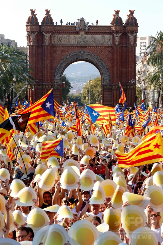 この日は、1714年にスペイン王フェリペ5世(Philip V)が州都バルセロナ(Barcelona)を征服した「カタルーニャの日」(ラ・ディアダ、La Diada)に当たる。デモはバルセロナを含む5都市で開かれ、参加者たちは明るい日差しの中、赤と黄色のしま模様のカタルーニャの州旗を掲げ、カタルーニャに暮らす750万人の人々は独立する準備ができていると声を上げた。