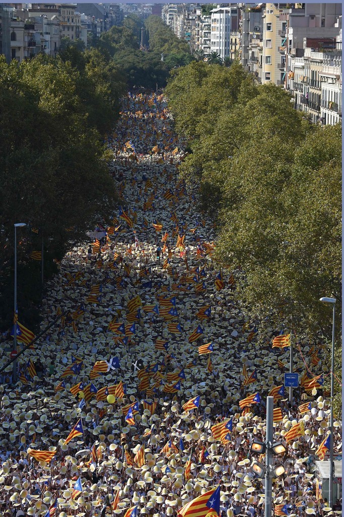 この日は、1714年にスペイン王フェリペ5世(Philip V)が州都バルセロナ(Barcelona)を征服した「カタルーニャの日」(ラ・ディアダ、La Diada)に当たる。デモはバルセロナを含む5都市で開かれ、参加者たちは明るい日差しの中、赤と黄色のしま模様のカタルーニャの州旗を掲げ、カタルーニャに暮らす750万人の人々は独立する準備ができていると声を上げた。
