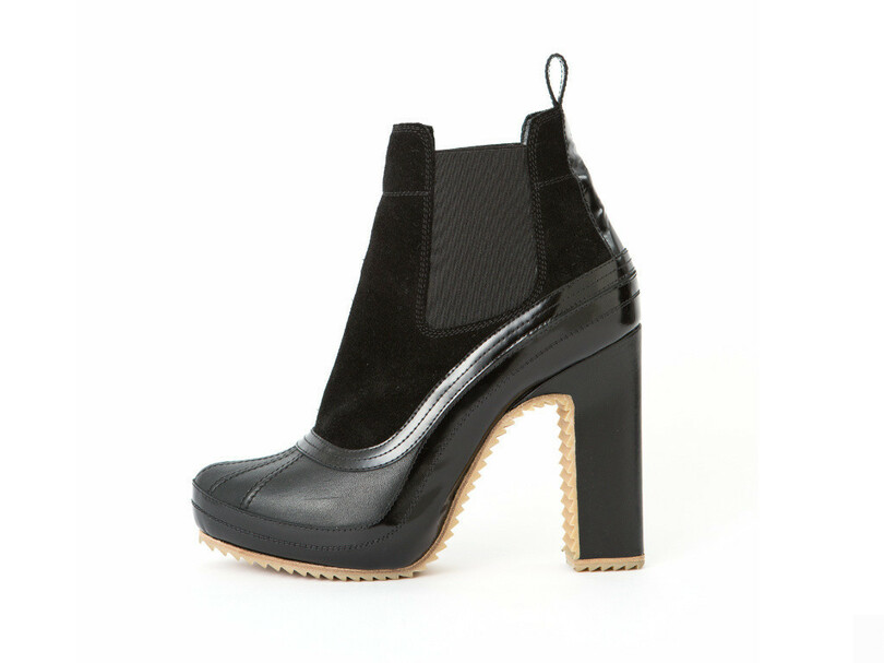 本コラボレーションでは、ダックブーツ(クラシカルなイギリスの新しいレインブーツ)のような丸みを帯びたつま先が目をひく2型を展開。伸縮性のあるクラシカルなジョッパーブーツをスポーティーに落とし込んだモデルと、スウェード素材のメッシュをアッパーに用いたオープンワークブーツタイプのモデルで ともにアンクル丈。細かなトップステッチとオーバーステッチのレザーバンド、ハニーカラーのラバーソールにストレートなハイヒールを合わせたハイブリッドなブーツに仕上がっている。