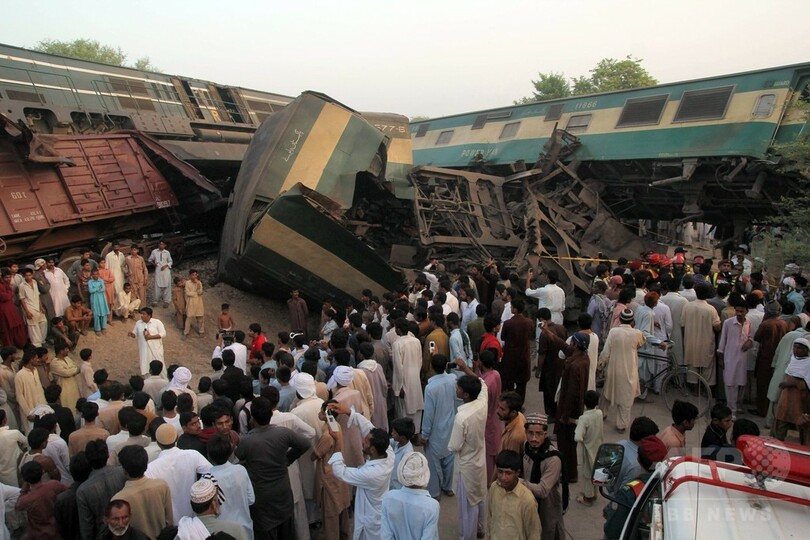 地元当局などによると、事故が起きたのは現地時間午前2時半(日本時間同午前6時半)ごろ。線路上を横断していた男性をはねたため停車していた貨物列車に、カラチ(Karachi)行きの急行列車が突っ込んだ。