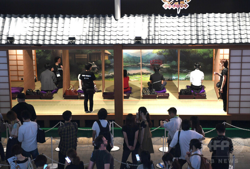 各社のブースでは、製品をアピールするコスプレーヤーたちに来場者の目が釘付けになる一方、注目のVRゲームを体験しようと順番を待つ長蛇の列ができていた。開催は18日まで。(c)AFPBB News