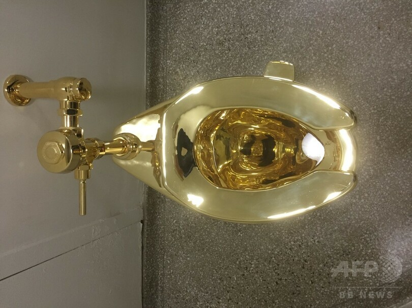 マルセル・デュシャン(Marcel Duchamp)が手掛けた小便器を使った作品「泉(Fountain)」を想起させるこの純金の便器は、「アメリカ(America)」というタイトルが付けられている。(c)AFP