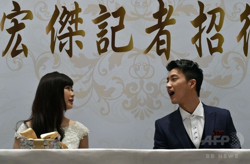 前日に東京都内でも記者会見を行った2人は、今月1日に結婚したことを報告した。(c)AFP