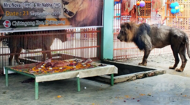 【9月22日 AFP】バングラデシュ南部チッタゴン(Chittagong)の動物園で21日、ライオン2頭の「結婚式」が行われ、ハートの形の肉のケーキが振る舞われた。