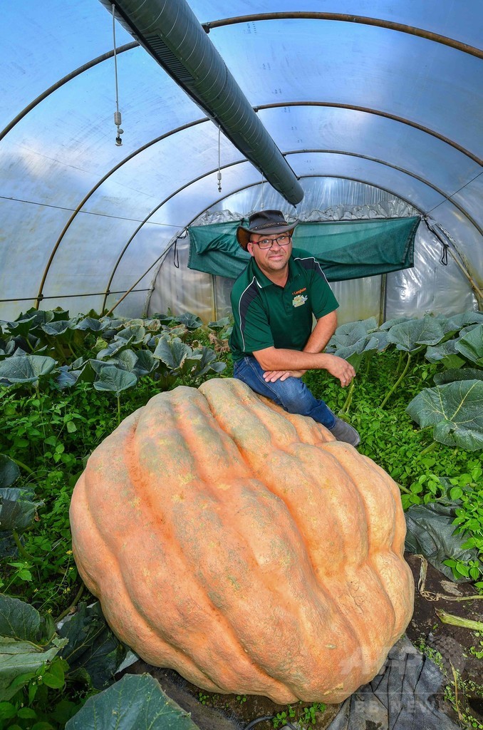 「パンプキン・オリー」の愛称で呼ばれるランハイムさんによると、このカボチャは1日あたり4~5キロ成長するという。(c)AFP