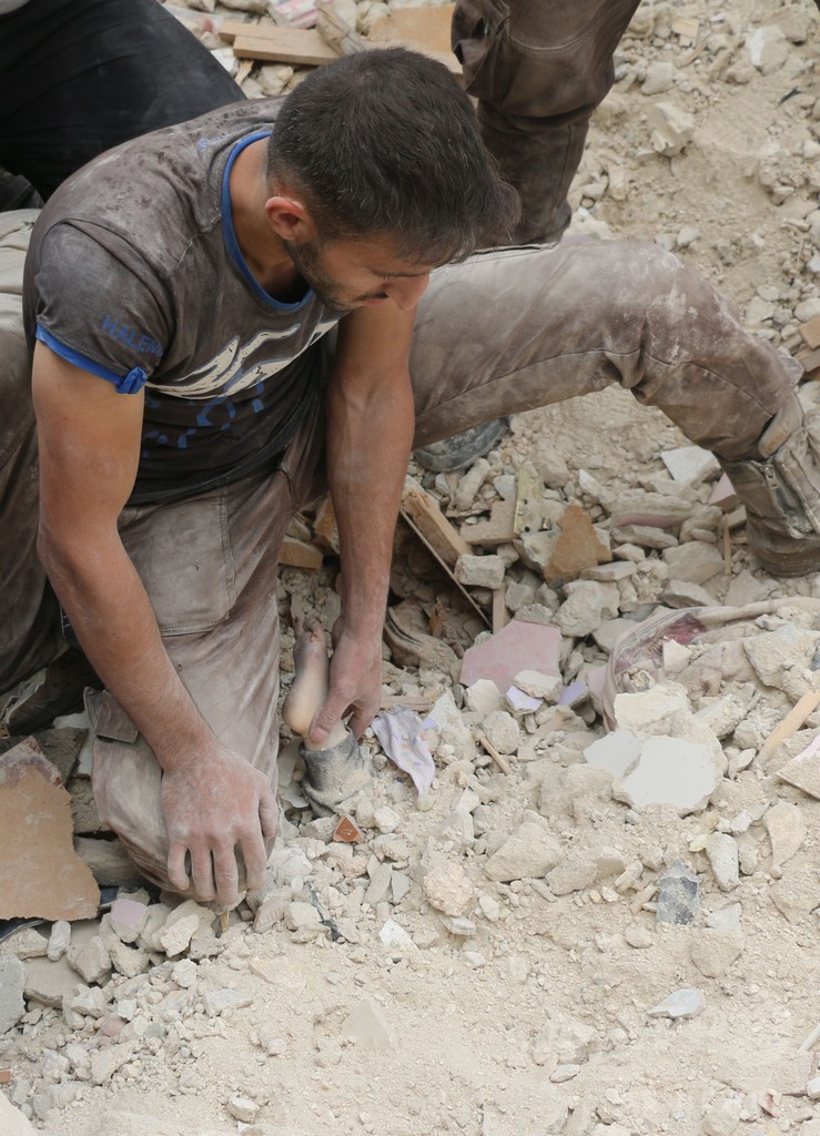 シリア北部アレッポのアルマルジャ地区で、空爆で倒壊した建物のがれきに埋もれた子供の遺体を掘り出そうとする男性(2016年9月23日撮影)。(c)AFP/AMEER ALHALBI