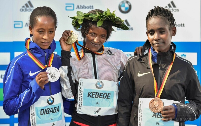 女子の部ではアベル・ケベデ(Aberu Kebede)が2時間20分45秒で自身3度目の大会制覇を遂げた。2位には2時間23分58秒でベルハネ・ディババ(Birhane Dibaba)、3位には2時間24分41秒でルティ・アガ(Ruti Aga)が続き、エチオピア勢が表彰台を独占している。(c)AFP