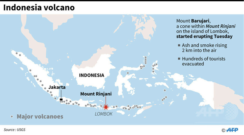 噴煙は上空2000メートルに達した。ロンボク島はバリ(Bali)島の東に位置し、毎年数千人が訪れる人気のハイキングコースがある。