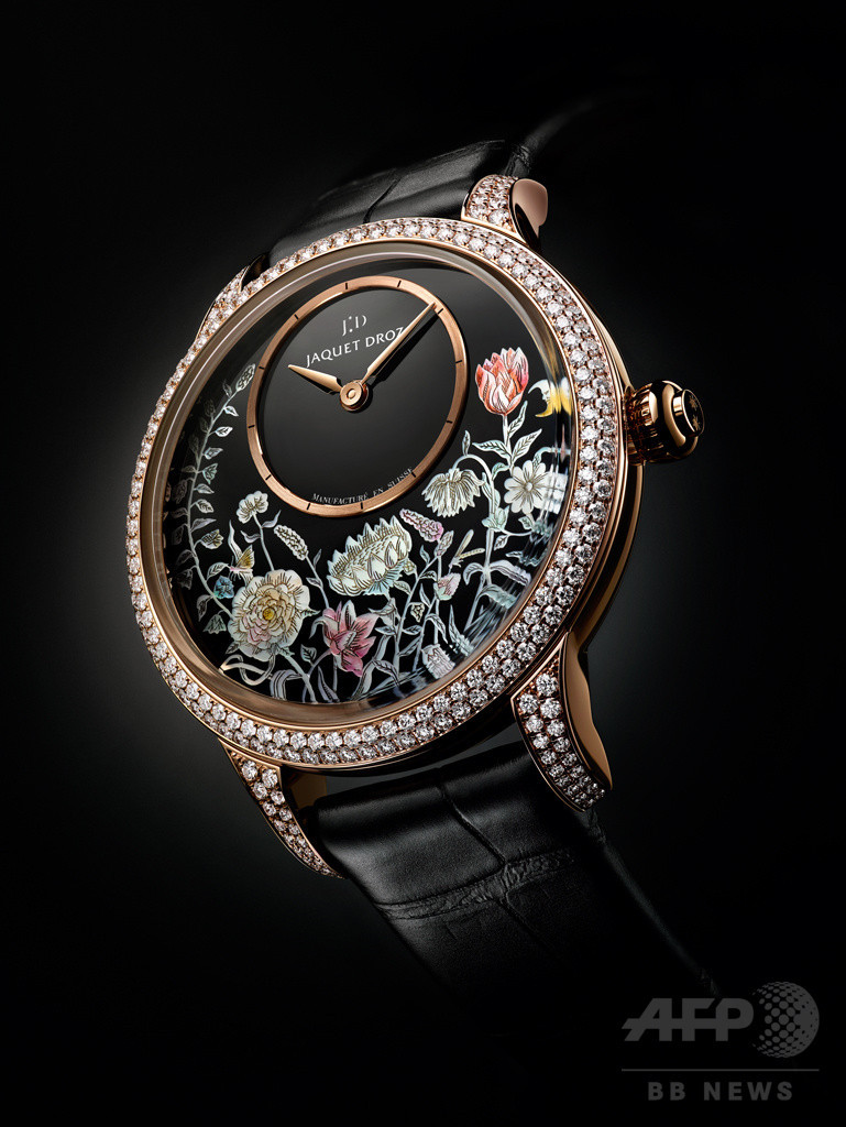 今回発売されたモデルでは、螺鈿技法など伝統工芸から着想を得た独自の装飾技術を取り入れており、光り輝く花畑を表現した文字盤が目を引く。エナメル装飾から細密画、まばゆいダイヤモンドセッティングやリアリティを追求した彫刻やエングレービングなど、「ジャケ・ドロー」の伝統技術を受け継ぐアトリエの職人たちによって、最高のノウハウが余すところなく発揮されている。