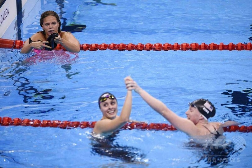リオデジャネイロ五輪・競泳女子100メートル平泳ぎでの勝利を銅メダルの米国のケイティ・マイリ(中央)と喜ぶ金メダルの米国のリリー・キング(右)を見る、ドーピング問題の渦中にあるロシアのユリア・エフィモワ(左)。(c)AFP/Martin Bureau