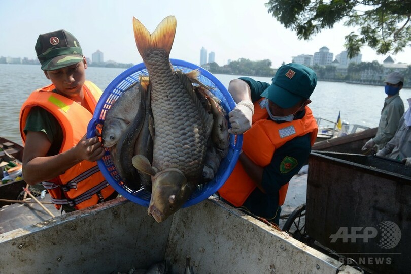 ニュース 社会 ベトナム・ハノイ最大の湖で魚が大量死、水質汚染か 2016年10月3日 17:22 発信地:ハノイ/ベトナム [ アジア・オセアニア ベトナム ] このニュースをシェア ‹ › ❮ 9/16 ❯ ベトナム・ハノイ最大の湖、タイ湖(西湖)から引き上げられた魚の死骸を回収する兵士ら(2016年10月3日撮影)。(c)AFP/HOANG DINH NAM 画像作成中 ! 【10月3日 AFP】ベトナムの首都ハノイ最大の湖であるタイ(Ho Tay)湖(西湖、West Lake)で先週末、大量の魚の死骸が打ち上げられているのが見つかった。地元メディアは、湖の深刻な水質汚染が原因と報じている。(c)AFP 社会 一覧へ> メディア・報道関係・法人の方向け 写真・動画 購入のお問合せ>