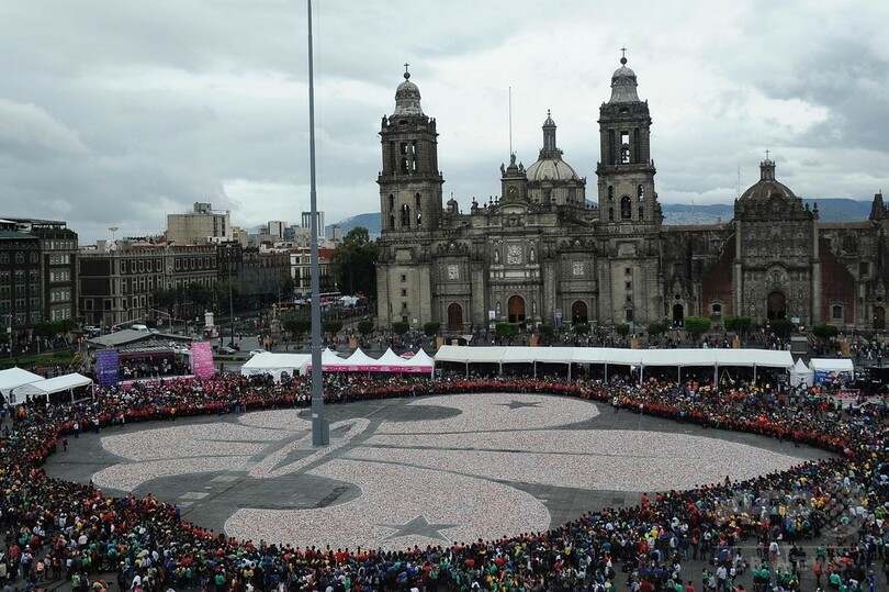 【10月11日 AFP】メキシコの首都メキシコ市(Mexico City)のソカロ広場(Zocalo Square)で9日、100万個以上のアルミ缶を並べて制作された、全長70メートルもの「フルール・ド・リス(Fleur-de-lis、ユリの花の紋章)」が登場した。(c)AFP