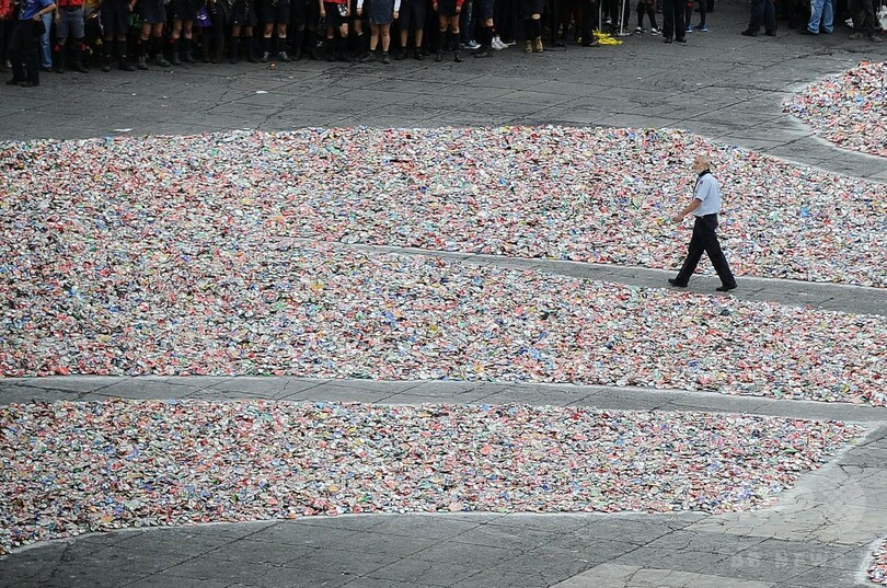 【10月11日 AFP】メキシコの首都メキシコ市(Mexico City)のソカロ広場(Zocalo Square)で9日、100万個以上のアルミ缶を並べて制作された、全長70メートルもの「フルール・ド・リス(Fleur-de-lis、ユリの花の紋章)」が登場した。(c)AFP