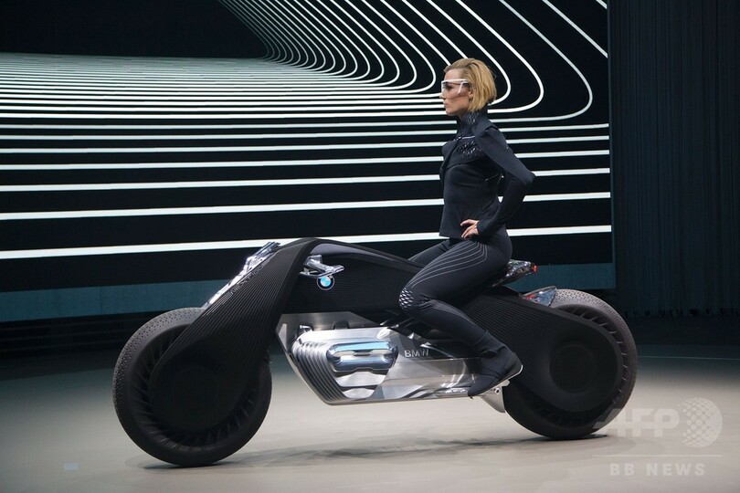 「Vision Next 100」はゼロエミッション(有害な排出物ゼロ)車で、完全に停止している状態でも倒れないよう設計された自動でバランスを取るタイヤを装備しており、ライダーがヘルメットなしでも走行できるほどの安定性があるという。(c)AFP