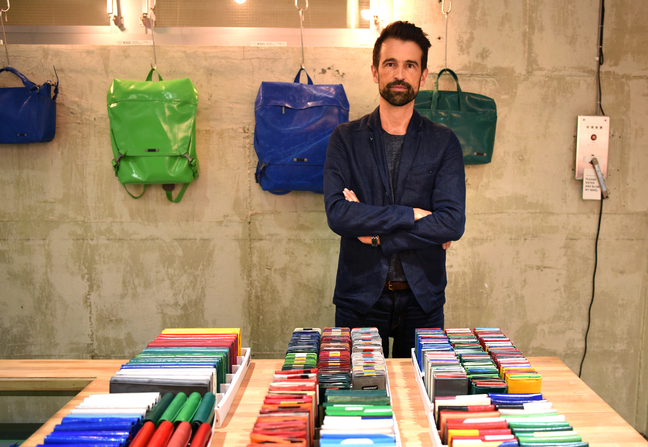 スイス生まれの「フライターグ」のバッグはすべてハンドメイドの一点もの。というのも、リサイクルしたトラックのタープ(幌)やシートベルト、自転車のインナーチューブが素材として使用されており、一つひとつ色柄や風合いが異なるからだ。また水や油などの汚れにも強く、色褪せしにくい商品はメッセンジャーバッグの代名詞となっている。「僕は自動車免許を持っていないから、これがいつもの移動手段だよ」とショップ内の自転車に笑顔でまたがるマーカスは生粋のサイクリスト。機能性抜群のデザインは彼らのリアルなライフスタイルから生まれている。