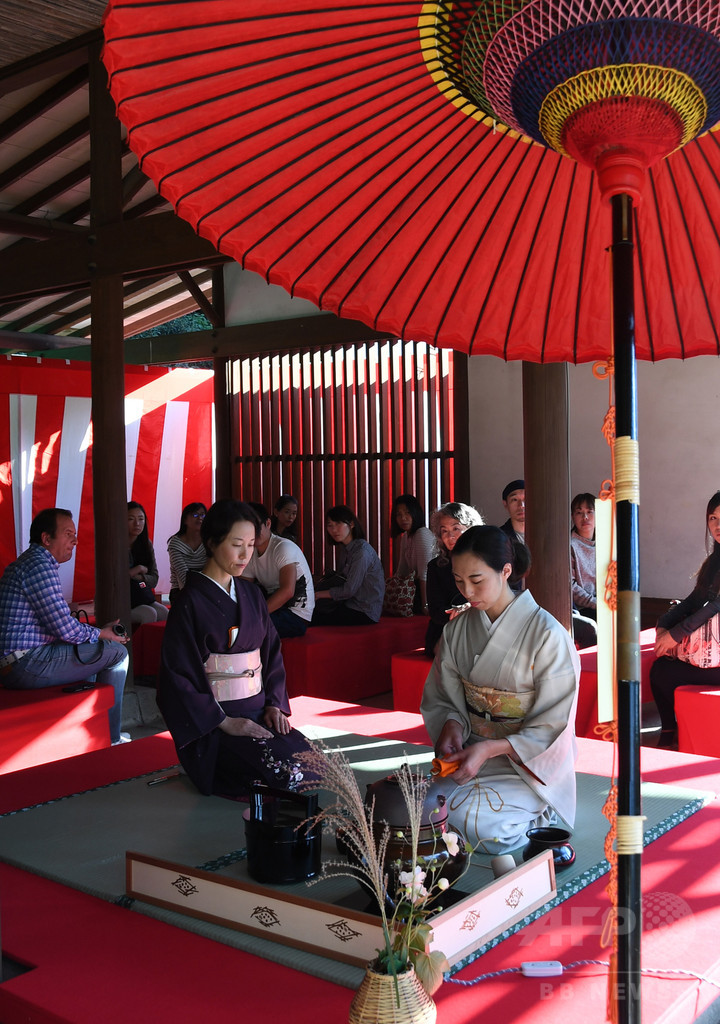 英語による茶道の解説のほか、生け花教室、三味線演奏など、日本の伝統文化を体験できる工夫が随所で凝らされている。スリランカから訪日中のサディカ・ウィックラマトゥンガ(Sadica Wickramathunga)さん(40)は、野だてを体験し、「お茶もおいしかったが、肉体的にだけでなく精神的にも楽しめた。ひとつひとつの作法が一種の瞑想(めいそう)のようだった」と目を輝かせていた。大茶会は16日まで。(c) AFPBB News