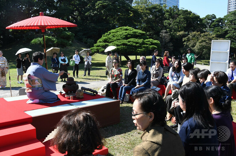 英語による茶道の解説のほか、生け花教室、三味線演奏など、日本の伝統文化を体験できる工夫が随所で凝らされている。スリランカから訪日中のサディカ・ウィックラマトゥンガ(Sadica Wickramathunga)さん(40)は、野だてを体験し、「お茶もおいしかったが、肉体的にだけでなく精神的にも楽しめた。ひとつひとつの作法が一種の瞑想(めいそう)のようだった」と目を輝かせていた。大茶会は16日まで。(c) AFPBB News