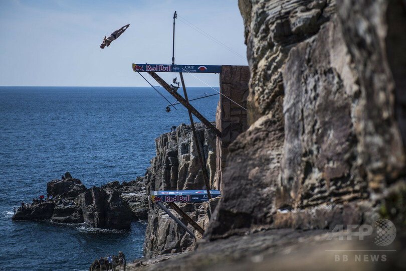 【10月16日 AFP】和歌山県白浜町の三段壁で15日、クリフダイビングの世界大会「レッドブル・クリフ・ダイビング・ワールド・シリーズ(Red Bull Cliff Diving World Series)」の第8戦1日目が開催された。(c)AFP