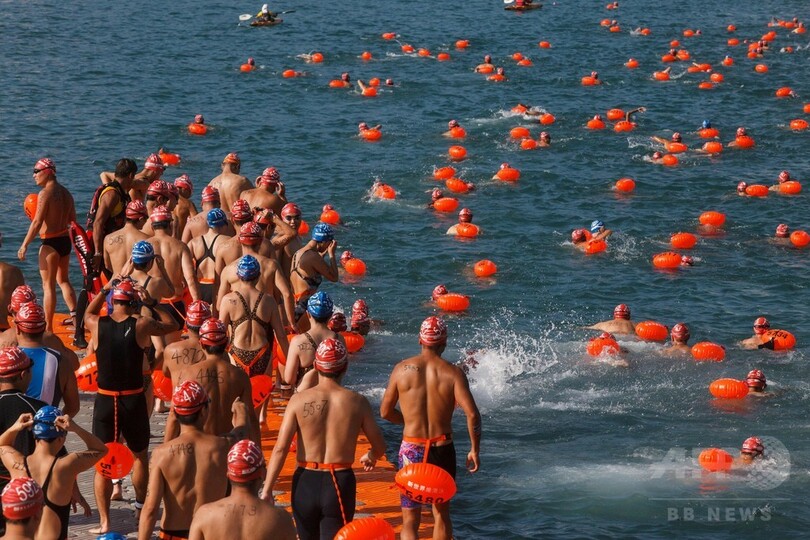 ビクトリアハーバー横断水泳大会で死者が出たのは、30年間の中断を経て2011年に再開されてから初めて。(c)AFP
