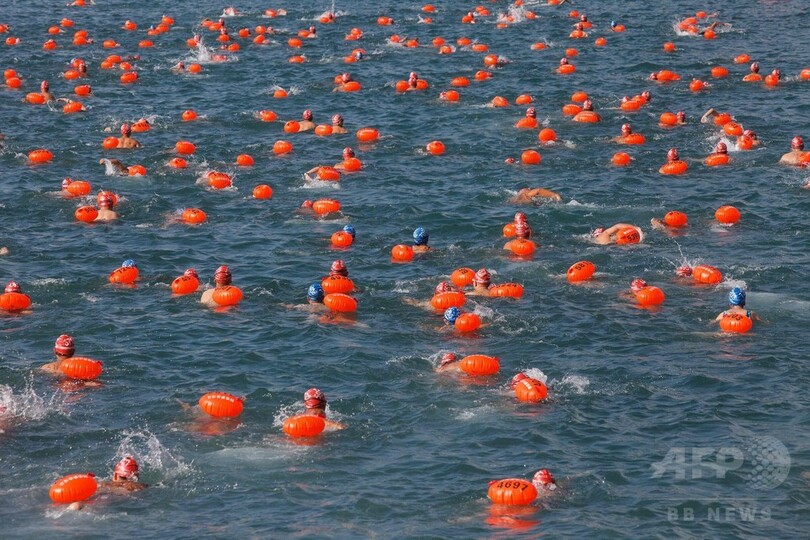 ビクトリアハーバー横断水泳大会で死者が出たのは、30年間の中断を経て2011年に再開されてから初めて。(c)AFP
